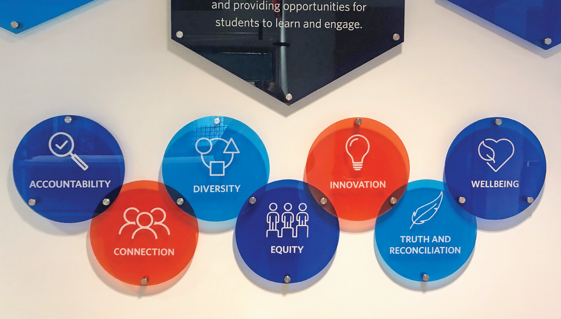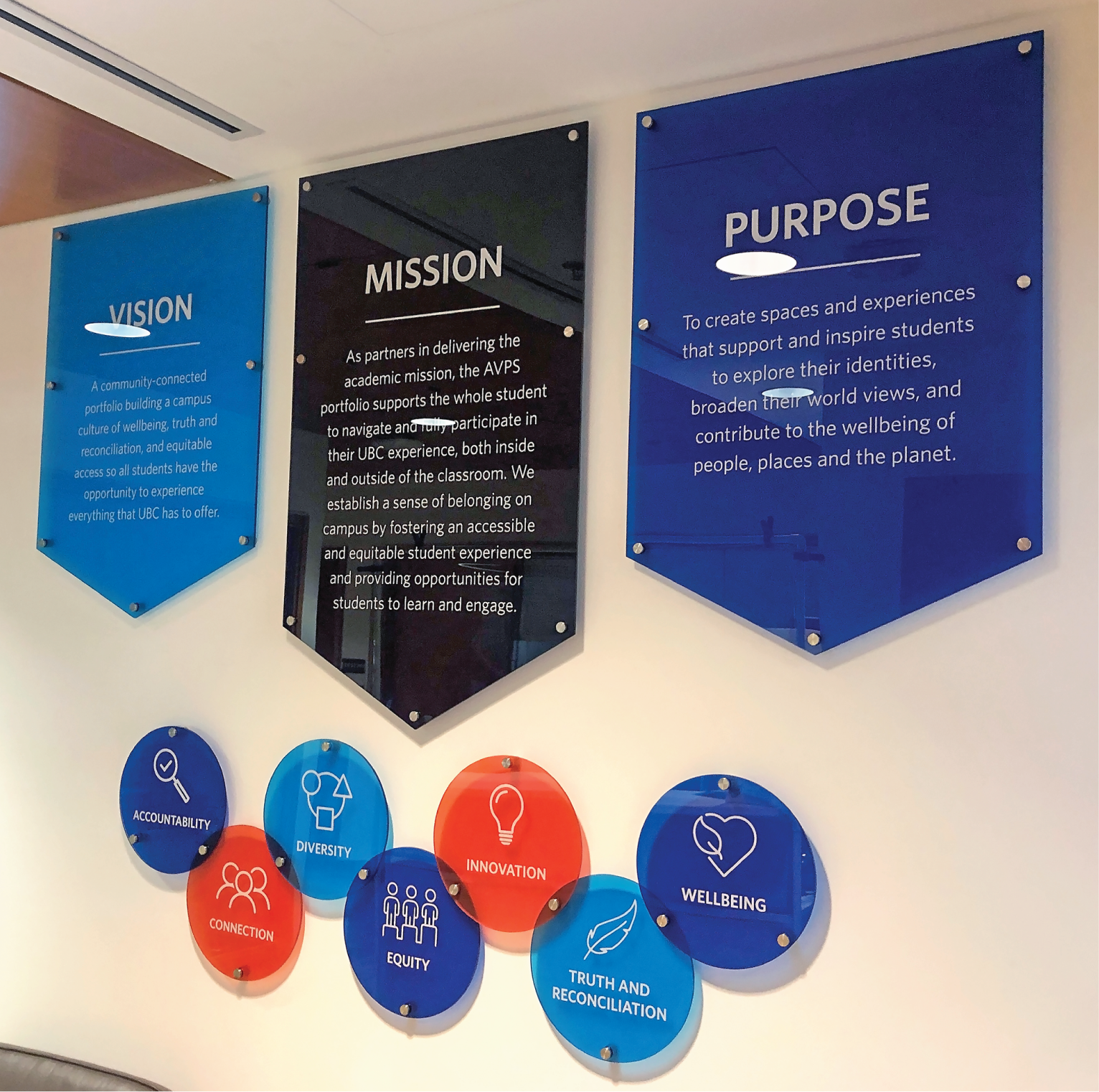 Signage designed for the AVP Students office entrance, showcasing their mission, vision, purpose, and guiding values. This signage directly aligns with the AVP Students Mission, Vision, Values publication.