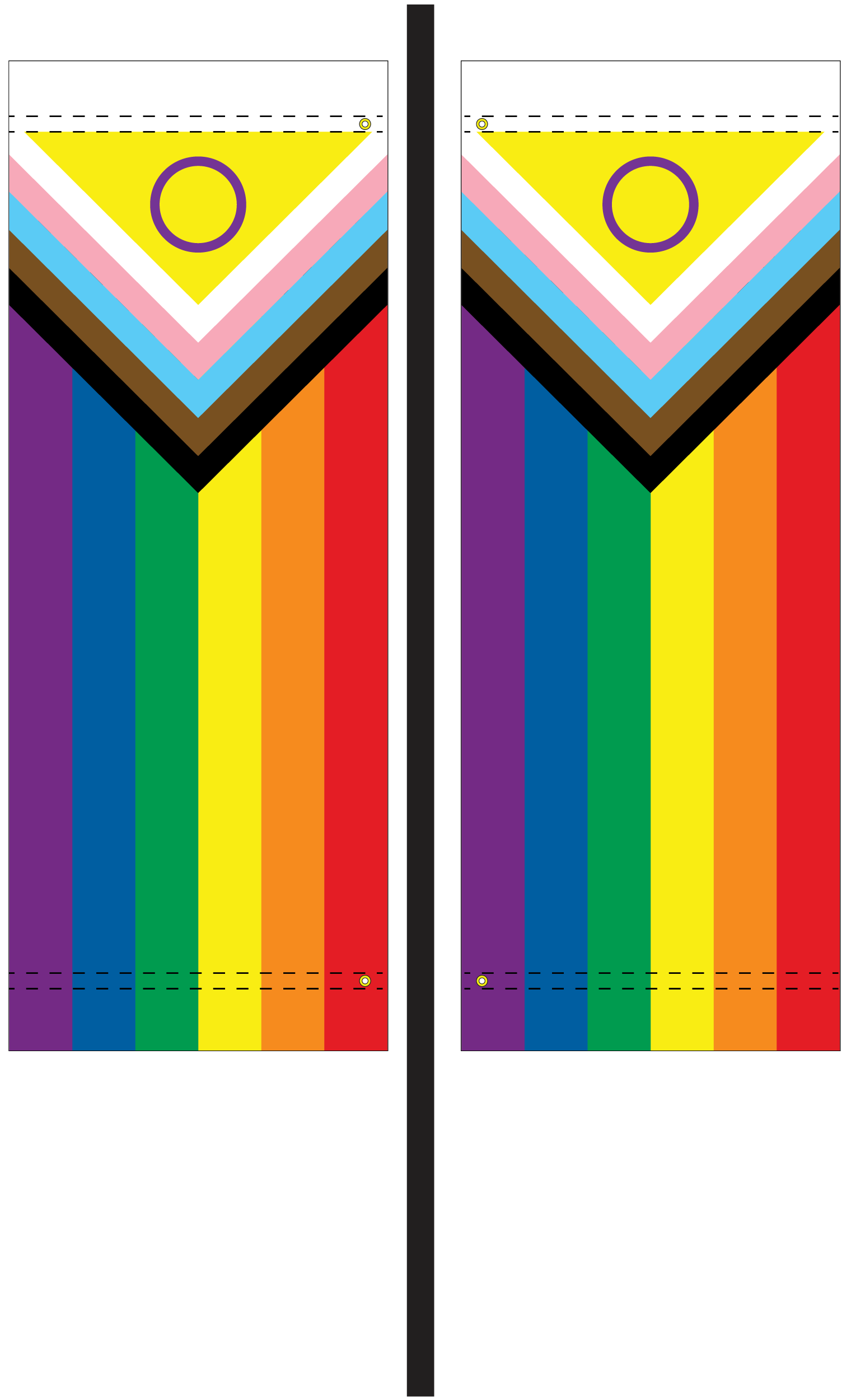 Street pole banners designed as part of Pride History Month and Queer Orientation at UBC Okanagan. The banners represent the 2SLGBTQIA+ community, as well as UBC Okanagan’s commitment to creating an inclusive campus community where 2SLGBTQIA+ people are seen, respected, and treated equitably. The banners feature the familiar rainbow flag and include chevrons of black and brown (standing for people of colour), as well as pink, blue and white (standing for the transgender community) and a purple ring in a gold triangle (representing the intersex community).